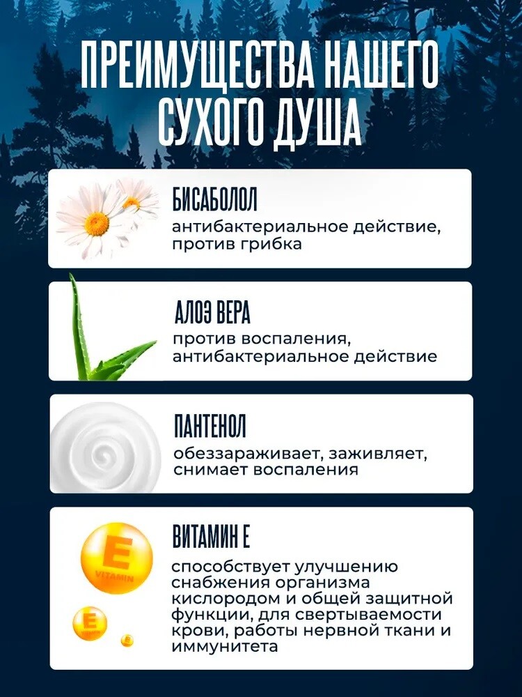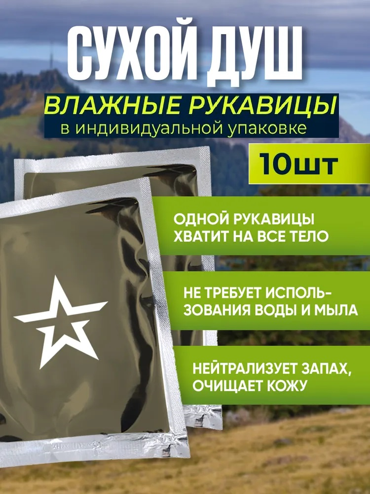 Влажные пенообразующие рукавицы - это комплект для личной гигиены рук, тела и волос в полевых и экстремальных условиях. Создан для того, чтобы можно было поддерживать чистоту, когда нет возможности обеспечить гигиену привычным способом. Может использоваться в походах, для солдат в военно-полевых условиях, при уходе за лежачими больными. В комплект входит 10 рукавиц, каждая в одноразовой упаковке, пропитанная нейтральным гелем, не требующим смывания. Преимущества сухого душа: компактный, легко пенится, нейтрализует запах, эффективно очищает и освежает кожу, не вызывает аллергии и раздражения, образует на коже защитную пленку, не требует смывания.